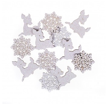 DREWNIANE SARENKI I ŚNIEŻYNKI SAMOPRZYLEPNE Z BROKATEM 3,5 CM, 12 SZT. BIAŁE