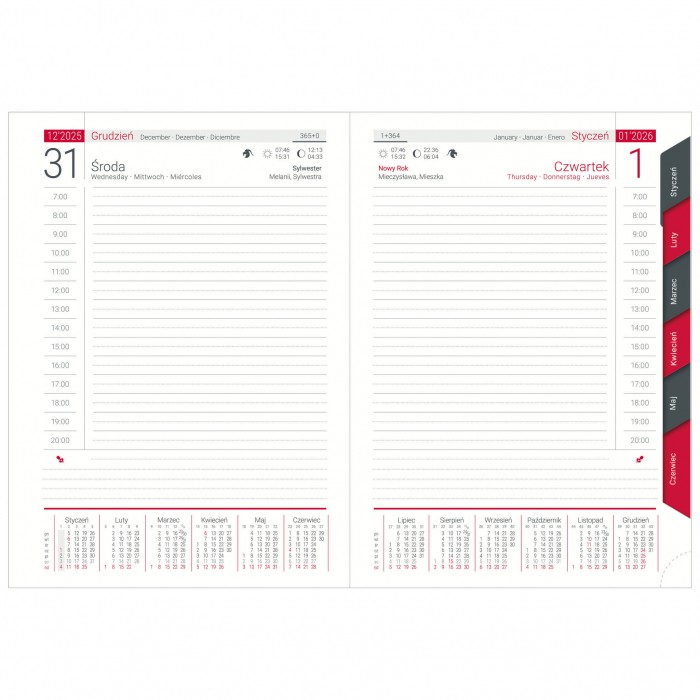 • Rodzaj: terminarz książkowy dzienny z registrami