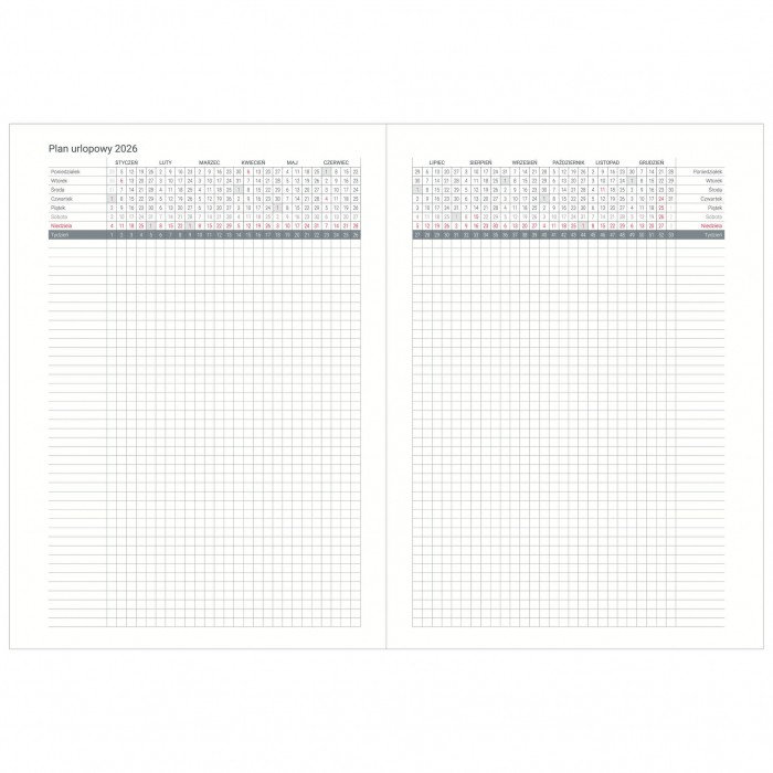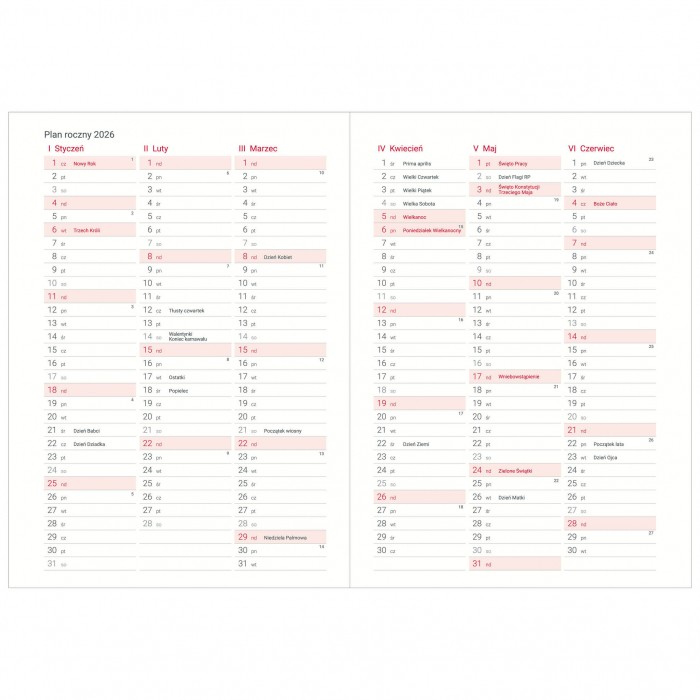 • Układ kalendarium: dzienny – 1 dzień na stronie