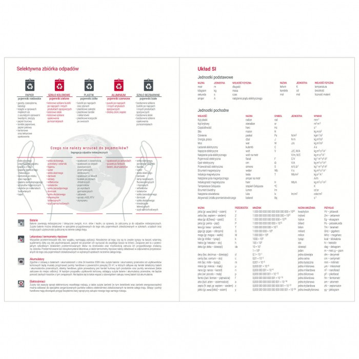 • Zawartość dodatkowa: plan roku, plan każdego miesiąca, kalendarium 2025–2027, wschody i zachody Słońca, fazy Księżyca, plan urlopowy, dni wolne w UE + UK, przybliżone odległości między stolicami Europy, informacje dla kierowców, wspólne oświadczenie o zdarzeniu drogowym, zasady pierwszej pomocy, adresy ambasad RP, zasady selektywnej zbiórki odpadów, układ SI, skorowidz teleadresowy, barwne mapy