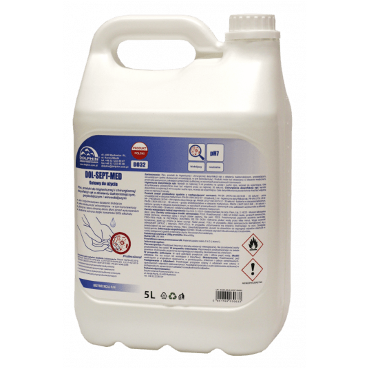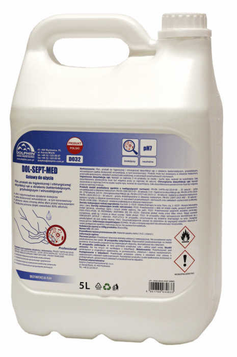 Płyn, produkt do higienicznej i chirurgicznej dezynfekcji rąk o działaniu bakteriobójczym, grzybobójczym i wirusobójczym Zalety: Pozwolenie na obrót: 3739/TP/2021 • silne i natychmiastowe działanie biobójcze • pełna skuteczność wirusobójcza – w tym koronawirusy • gliceryna i aloes chronią skórę dłoni przed wysuszaniem • skuteczna ochrona dzięki zawartości 80% alkoholu Zastosowanie: Płyn, produkt do higienicznej i chirurgicznej dezynfekcji rąk o działaniu bakteriobójczym, grzybobójczym, wirusobójczym (pełna skuteczność wirusobójcza, w tym koronawirusy). Produkt może być stosowany w obszarze medycznym, przemyśle spożywczym, zakładach użyteczności publicznej, w warunkach przemysłowych i domowych. Higieniczna dezynfekcja rąk: Nanieść co najmniej 3 ml produktu na czyste i suche ręce, wcierać do wyschnięcia. Cała dezynfekowana powierzchnia musi być wilgotna przez co najmniej 30 sekund. Chirurgiczna dezynfekcja rąk: Nanieść dwukrotnie co najmniej 3 ml na czyste i suche ręce, wcierać do wyschnięcia. Cała dezynfekowana powierzchnia musi być wilgotna przez co najmniej 3 minuty. Przebadany pod względem działania i stosowania: PN-EN 14476+A2:2019-08 / PN-EN 1500:2013-07 / PN-EN 12791:2016-04 / PN-EN 13727+A2:2015-12 / PN-EN 13624:2013 / PN-EN 13697:2015 06E / PN-EN 14348:2006