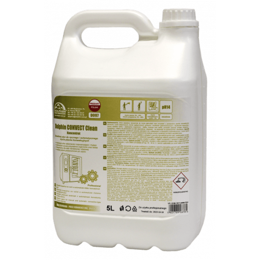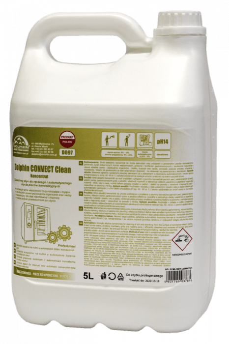 DOLPHIN CONVECT CLEAN 5L to silnie zasadowy (alkaliczny) preparat przeznaczony do profesjonalnego czyszczenia pieców konwekcyjno-parowych (konwektomatów). Skutecznie usuwa najtrwalsze zabrudzenia powstałe podczas obróbki cieplnej żywności. Płyn jest stworzony do stosowania w systemach mycia automatycznego pieców, ale nadaje się również do czyszczenia ręcznego. Produkt doskonale radzi sobie z przypaleniami, tłuszczami, białkiem i zwęglonymi resztkami.