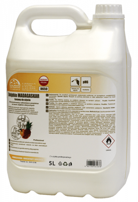 Skoncentrowany odświeżacz powietrza na bazie olejków eterycznych Zalety: • skutecznie eliminuje nieprzyjemne zapachy • pozostawia długotrwałą świeżość po użyciu • polecany do wszelkich pomieszczeń użytkowych • idealny do neutralizacji zapachu w sanitariatach Zastosowanie: Do wszelkich pomieszczeń użyteczności publicznej, ze szczególnym uwzględnieniem sanitariatów. Sposób użycia: Rozpylić za pomocą atomizera w mało widocznym miejscu lub muszli klozetowej.