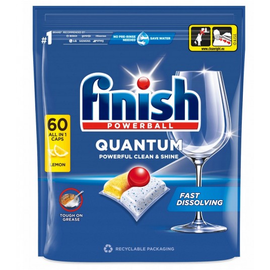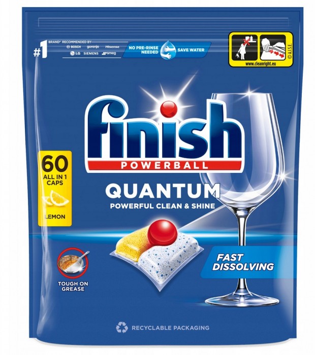 Finish Quantum All in 1 Lemon sprawdza się zarówno w programach oszczędnych, jak i intensywnych wysokotemperaturowych cyklach. Dzięki zaawansowanej kompozycji składników czyszczących, kapsułki pomagają uzyskać lśniące szkło, czyste talerze, naczynia żaroodporne i sztućce, nawet przy pełnym załadunku zmywarki.