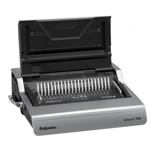 Fellowes Galaxy-e 500 to funkcjonalna i wytrzymała bindownica elektryczna do oprawy dokumentów grzbietami plastikowymi do użytku w dużym biurze. Umożliwia jednoczesne dziurkowanie do 28 kartek A4 (80 g/m2) i oprawę dokumentu o grubości do 510 arkuszy o maksymalnej średnicy grzbietu 51 mm. System dziurkowania elektrycznego znacząco przyspiesza i usprawnia proces oprawy dokumentów, a wyjmowana platforma bindującą (Satellite® System) umożliwia oprawę dokumentów przez 2 osoby w tym samym czasie. System dziurkowania pionowego umożliwia niezależne dziurkowanie i nakładanie dokumentów na grzbiet. Wyposażona w solidny, metalowy mechanizm dziurkowania oraz w szufladę do przechowywania grzbietów z opatentowanym systemem mierzenia grubości dokumentów i doboru odpowiedniego grzbietu i szufladę na ścinki. Łatwa w konserwacji: okienko w szufladzie pozwala na sprawdzenie ilości ścinków, a system przepełnienia ścinkami otwiera automatycznie szufladę. Prosta w obsłudze: regulacja linii dziurkowania od krawędzi (2 pozycje: min. 2,5 mm, max 4,5 mm) oraz 3 przyciski (A4, A5, Letter) dostosowujące linię dziurkowania znacząco ułatwiają użytkowanie, a obustronna dźwignia dziurkowania zmniejsza siłę nacisku potrzebną do przedziurkowania pliku kartek. W pakiecie z bindownicą komplet 20 opraw (grzbiet + okładki) do bindowania dokumentów. Urządzenie objęte jest 2-letnią gwarancją producenta.