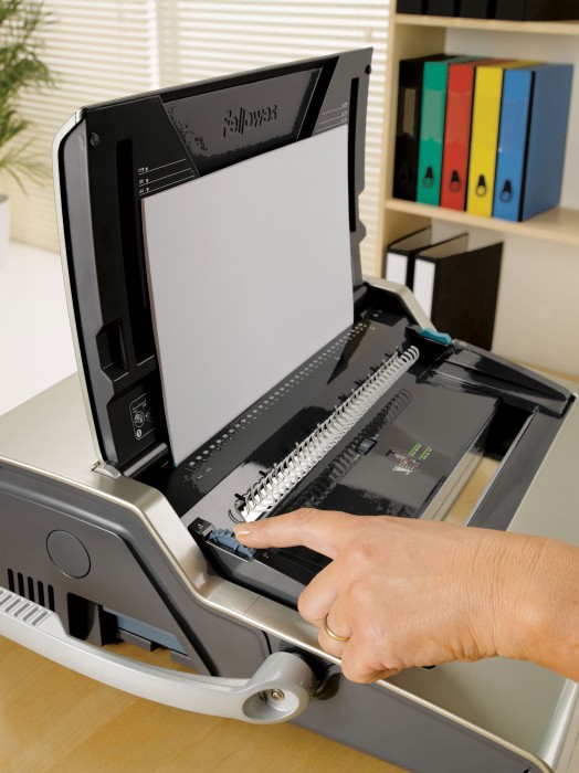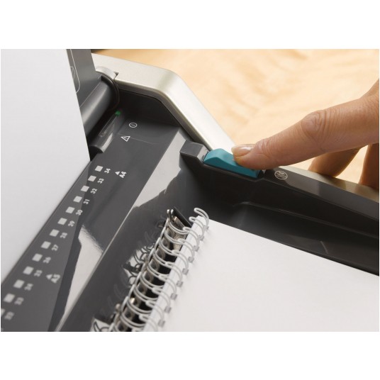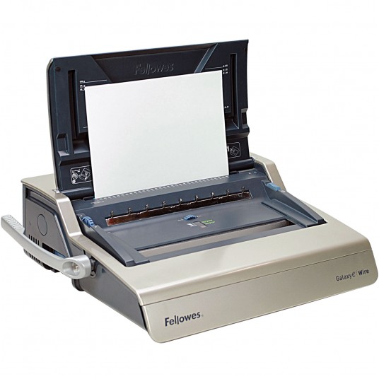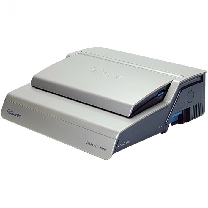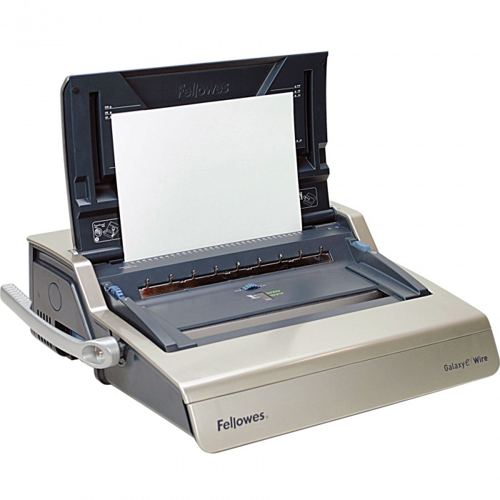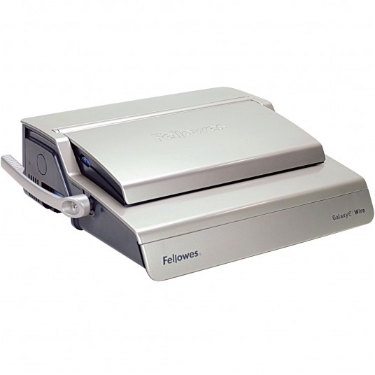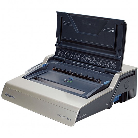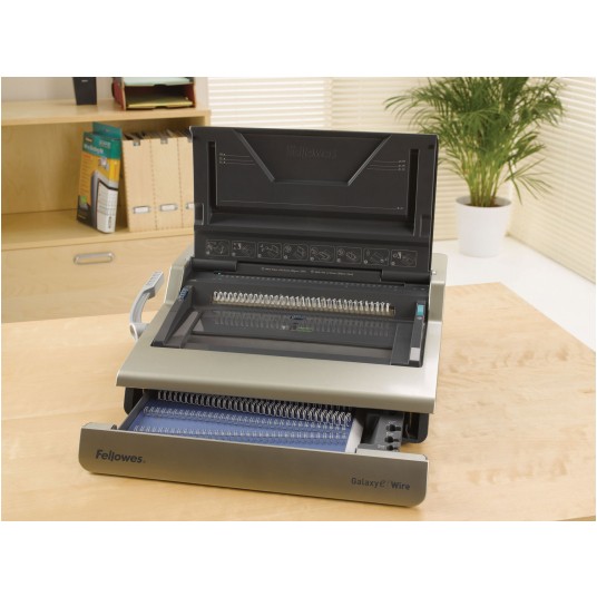 Fellowes Galaxy-e Wire to funkcjonalna i wytrzymała bindownica do oprawy dokumentów grzbietami drutowymi do użytku w dużym biurze. Umożliwia jednoczesne dziurkowanie do 20 kartek A4 (80 g/m2) i oprawę dokumentu o grubości do 130 arkuszy o maksymalnej średnicy grzbietu 14 mm. Blokada szerokości zamknięcia grzbietu dla dokumentów o tej samej grubości przyspiesza wykonanie wielu opraw kopii dokumentu, a system dziurkowania elektrycznego znacząco usprawnia proces oprawy dokumentów. System dziurkowania pionowego umożliwia niezależne dziurkowanie i nakładanie dokumentów na grzbiet. Wyposażona w solidny, metalowy mechanizm dziurkowania oraz wyposażona w szufladę do przechowywania grzbietów z opatentowanym systemem mierzenia grubości dokumentów i doboru odpowiedniego grzbietu i szufladę na ścinki. Łatwa w konserwacji: okienko w szufladzie pozwala na sprawdzenie ilości ścinków, a system przepełnienia ścinkami otwiera automatycznie szufladę. Prosta w obsłudze: precyzyjne wyśrodkowanie linii dziurkowania za pomocą pokrętła ułatwia użytkowanie, a obustronna dźwignia dziurkowania zmniejsza siłę nacisku potrzebną do przedziurkowania pliku kartek. W pakiecie z bindownicą komplet 20 opraw (grzbiet + okładki) do bindowania dokumentów. Urządzenie objęte jest 2-letnią gwarancją producenta.