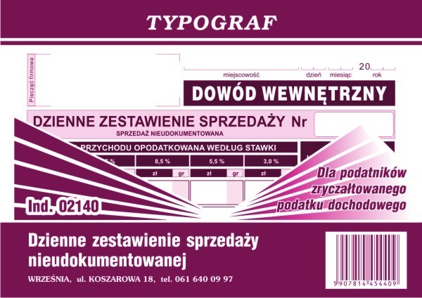 DZIENNE ZESTAWIENIE SPRZEDAŻY NIEUDOKUMENTOWANEJ DLA PODATNIKÓW ZRYCZAŁTOWANEGO PODATKU DOCHODOWEGO 1-3 A4