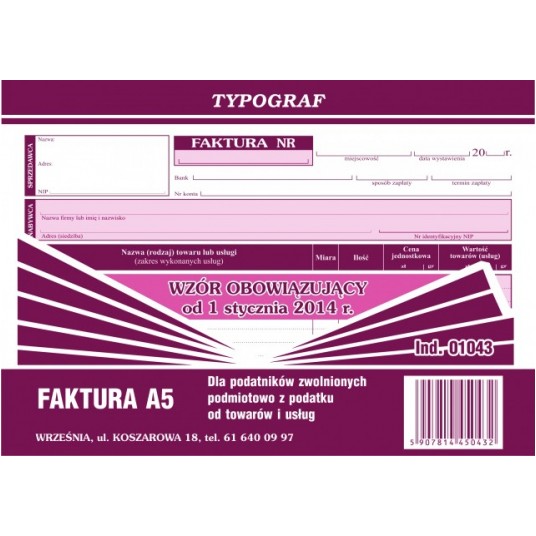 FAKTURA A5 TYPOGRAF POZIOM DLA ZWOLNIONYCH 01043