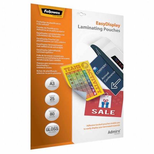 Folie do laminacji zapewniają doskonałą ochronę dokumentów przed wilgocią, kurzem i zabrudzeniem. Zabezpieczają je przed ewentualną interwencją w ich treść, zapewniając doskonałą ochronę i wygląd. Laminowanie fotografii poprawia ich kolorystykę oraz zabezpiecza przed wyblaknięciem w miarę upływu czasu. Folie samoprzylepne do laminacji typu “naklejka” od Fellowes o grubości 80 mikronów są przeznaczone do laminacji plakatów, informatorów, oznakowania, fotografii, rysunków, etc. w rozmiarze A3, z dodatkową warstwą samoprzylepną, umożliwiającą przyklejenie na dowolnej płaskiej powierzchni. W opakowaniu 25 sztuk.