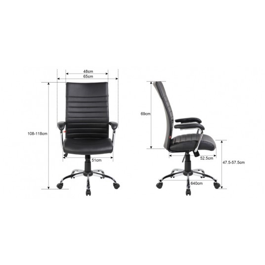 fotel biurowy z mechanizmem typu TILT możliwość swobodnego kołysania oraz blokady pozycji do pracy regulacja wysokości siedziska w zakresie: 108-118 CM komfortowe i ergonomiczne oparcie wykonane z poliuretanu i PVC materiałowe podłokietniki stalowa podstawa rekomendowane maksymalne obciążenie: 100 kg szerokość siedziska: 65 cm (w najszerszym punkcie) głębokość siedziska: 63 cm (w najszerszym punkcie) wysokość oparcia: 108-118 cm (wysokość robocza) kolor: czarny