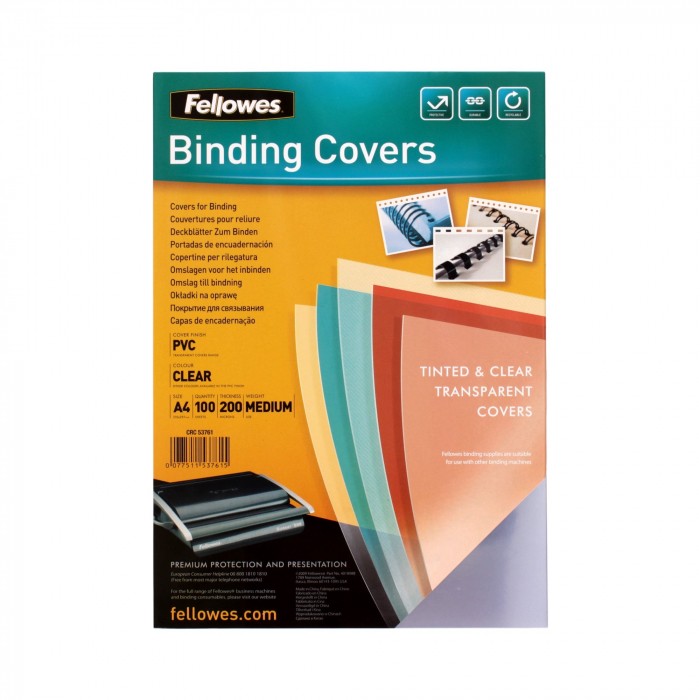 Przezroczyste (bezbarwne) okładki do bindowania Fellowes w rozmiarze A4 i grubości 200 µm. Zapewniają profesjonalną prezentację dokumentów z widoczną pierwszą stronę, co ułatwia szybką identyfikację dokumentów. W opakowaniu 100 sztuk.