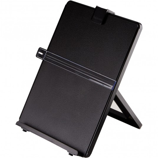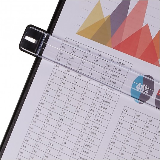 Składana, łatwa do przechowywania w szufladzie lub kieszeni torby na laptop. Klips może utrzymać dokumenty o grubości do 125 kartek i rozmiarze A4. Zdejmowana, przezroczysta linijka ułatwia korzystanie z dokumentów. Po złożeniu może służyć jako podpórka do notowania.