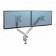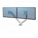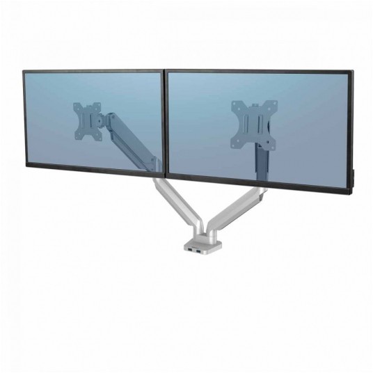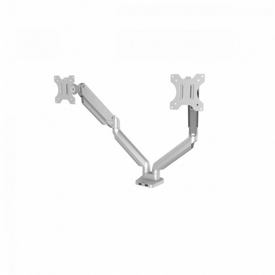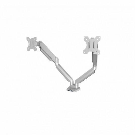 W pełni niezależne, regulowane ramię na 2 monitory Platinum Series™ (w układzie poziomym) w kolorze srebrnym, z technologią sprężyny gazowej, która umożliwia łatwe dostosowanie monitora do pracy oraz współdzielenie ekranu: – pozwala na zwiększenie ilości wolnego miejsca na biurku, przeciwdziałając zmęczeniu oczu, szyi i ramion, – umożliwia łatwą regulację za sprężyny gazowej, dzięki której szybko i precyzyjnie zmienisz położenie monitora, z możliwość obrotu ramienia o 360° i nachylenia ekranu monitora od -45° do 45°, – wyposażone w 2 porty USB typu A, umożliwiające podłączenie ulubionych urządzeń, – łatwe w montażu za pomocą zacisku do krawędzi biurka lub oczka (przelotki) w blacie, – zapewnia zgodność ze standardem VESA 75×75 i 100×100. Produkt objęty jest 3-letnią (ograniczoną) gwarancją. Produkt przetestowany przez FIRA International Ltd. pod kątem zgodności z wymogami ergonomii określonymi w europejskim prawodawstwie dotyczącym zdrowia i bezpieczeństwa pracy biurowej: EN ISO 9241-5.