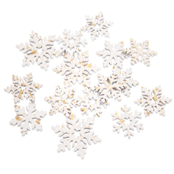 Drewniane śnieżynki w białym kolorze, posiadające ozdobne złocenia to stylowy dodatek do prac kreatywnych typu cardmaking, scrapbooking czy home decor. Sprawdzą się idealnie przy zimowo-świątecznych projektach takich jak ozdoby choinkowe, świeczniki, wień