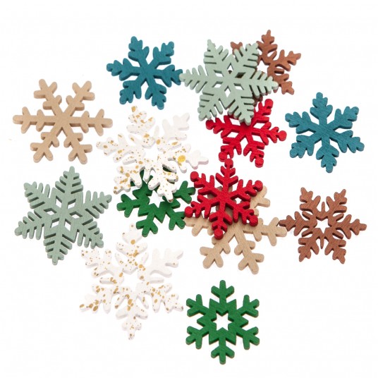 Drewniane śnieżynki w zimowo-świątecznych kolorach, to świetny dodatek do bożonarodzeniowych prac kreatywnych. Dodatkowym zdobieniem na części śnieżynek znajdują się złote przetarcia, które nadają im stylowego połysku. Śnieżynki te można wykorzystać prz