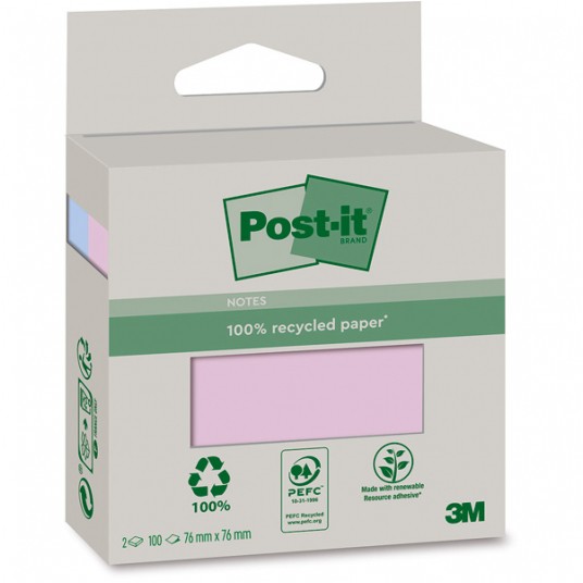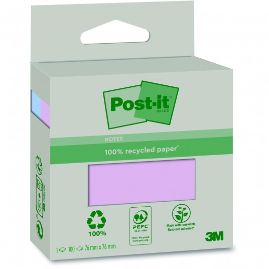 Ekologiczne karteczki Post-it® Recycled wykonane są w 100% z makulatury. Posiadają certyfikat PEFC Recycled, który gwarantuje, że surowce do ich produkcji pochodzą z odnawialnych i odpowiedzialnie zarządzanych lasów. Łatwo się przyklejają do różnych powierzchni, dzięki zastosowaniu kleju uzyskanego w 60% z surowców naturalnych pochodzących z corocznie odrastajacych roślin. Specjalnie dobrane, jasne kolory karteczek przykuwają uwagę do zapisanych na nich informach. Opkowanie zawiera 2 bloczki po 100 karteczki o wymiarach 76x76 mm.