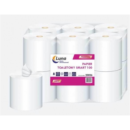 Papier toaletowy Smart Luna 2W 100 m to praktyczne rozwiązanie do łazienek w biurach, szkołach, instytucjach oraz w domu. Dzięki dwuwarstwowej strukturze łączy w sobie chłonność i miękkość, a rolka o długości 100 metrów gwarantuje wydajność i wygodę użytkowania. Ekonomiczne opakowanie zawierające 12 rolek to pewność oszczędności i rzadszej wymiany.