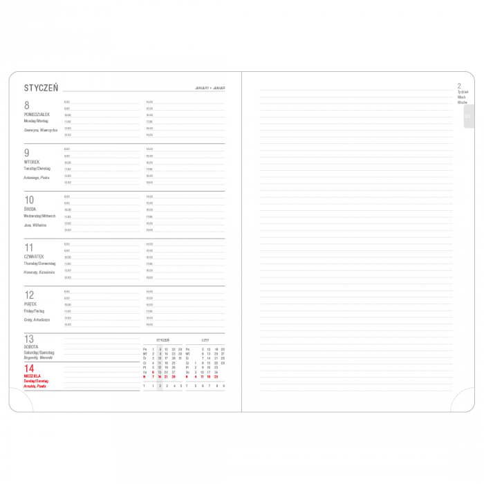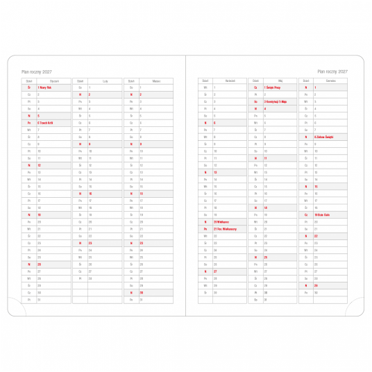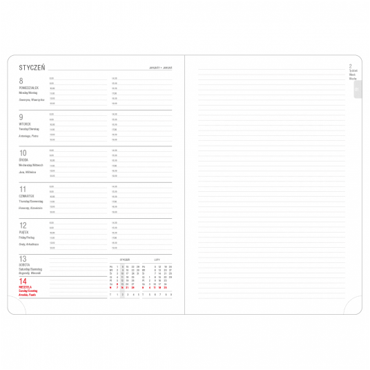 • Układ kalendarium: tygodniowy – 1 tydzień na stronie