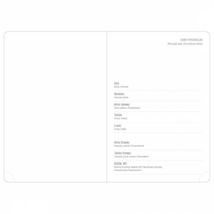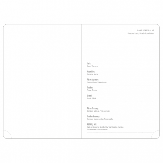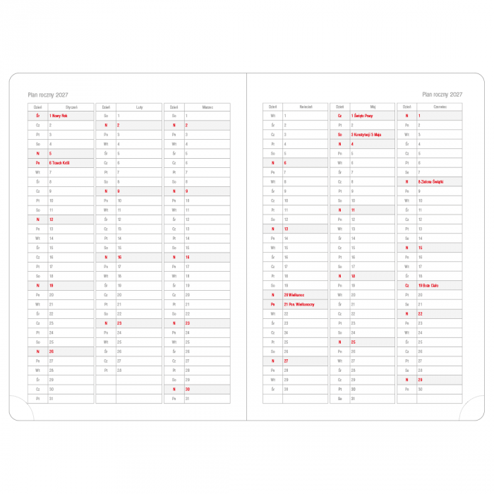 • Dodatki: skrócony kalendarz bieżącego i następnego miesiąca, dodatkowe miejsce na notatki, registry drukowane, zakładka tasiemkowa, perforowane narożniki